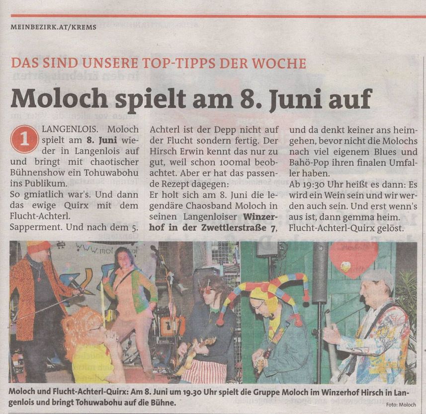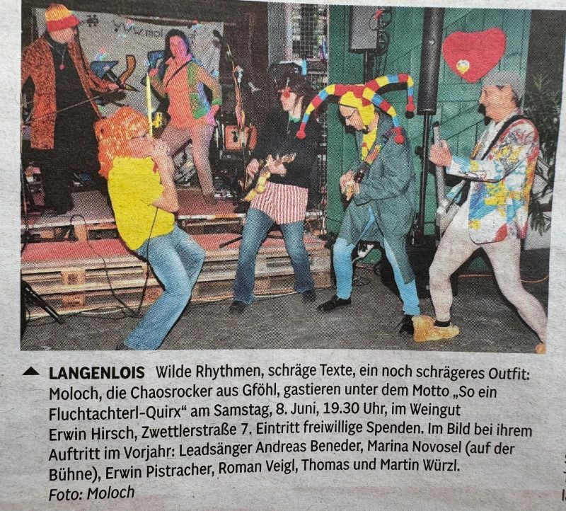 Und nach dem 5. Achterl ist der Depp nicht auf der Flucht sondern fertig. Der Hirsch Erwin kennt das nur zu gut, weil schon 100mal beobachtet. Aber er hat das passende Rezept dagegen: Er holt sich am 8. Juni die legendäre Chaosband Moloch in seinen Langenloiser Winzerhof in der Zwettlerstraße 7, und da denkt keiner ans heimgehen, bevor nicht die Molochs nach viel eigenem Blues und Bahö-Pop ihren finalen Umfaller haben.